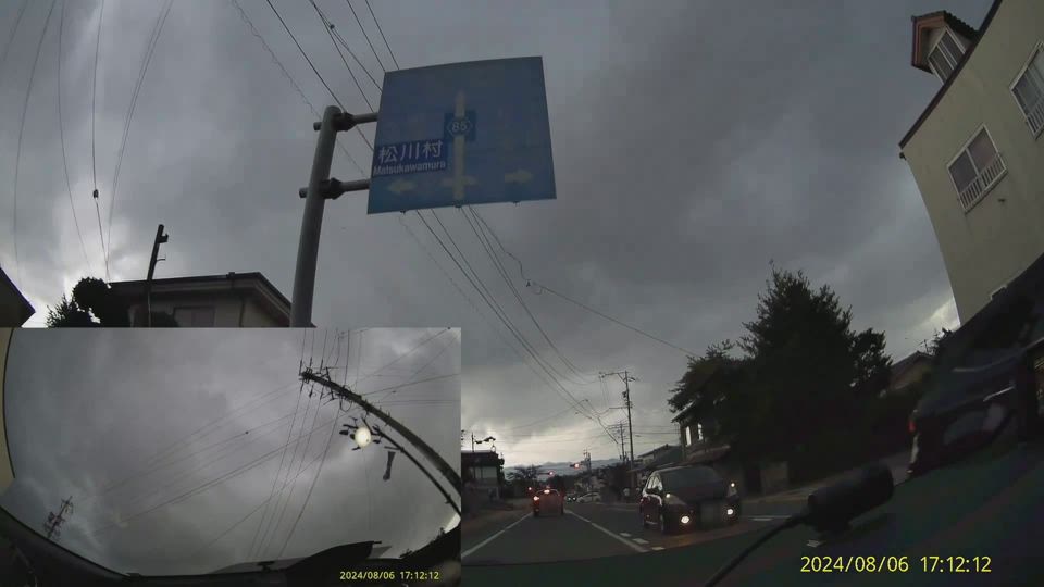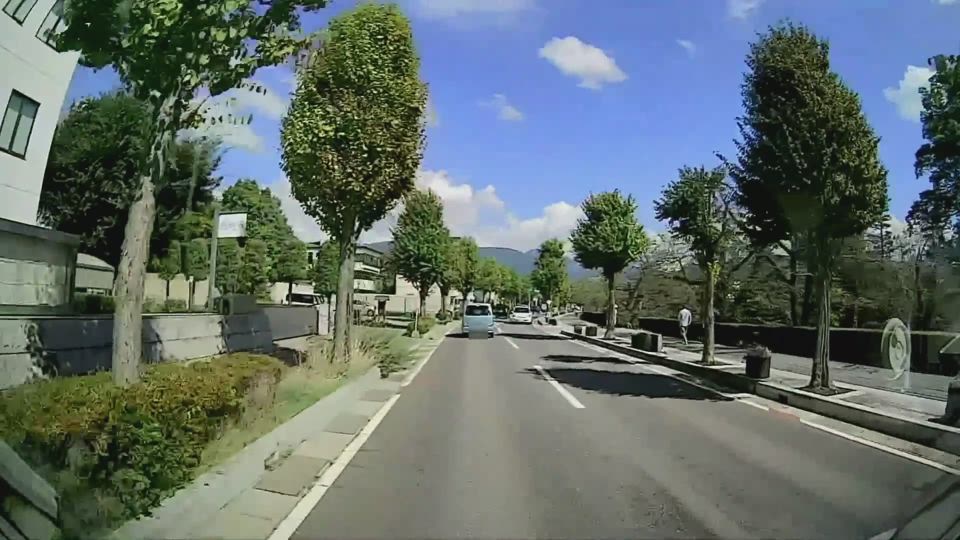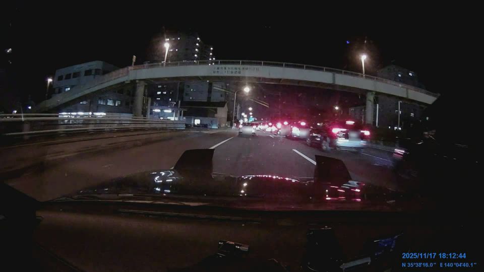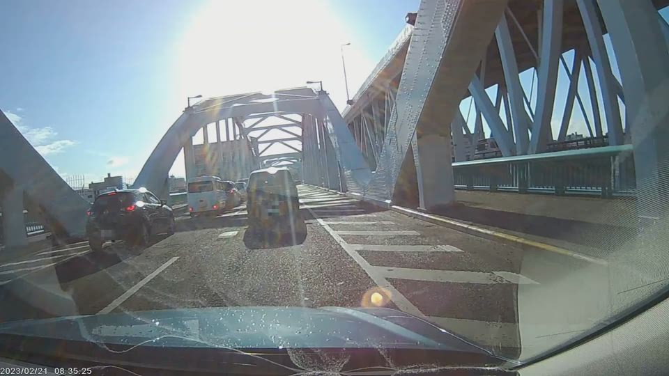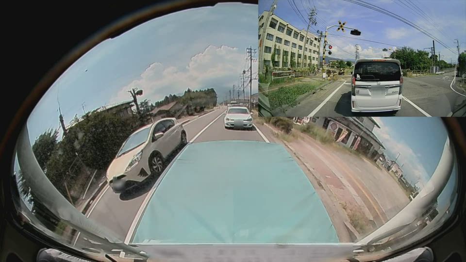 右の車線から車線変更で飛び出してきた。難なく避けていますが、間一髪です。 実はリアカメラの映像のほうが怖いです。衝突しそうになっているにも関わらず、ブレーキもかけずにそのまま車線変更を完了させています。